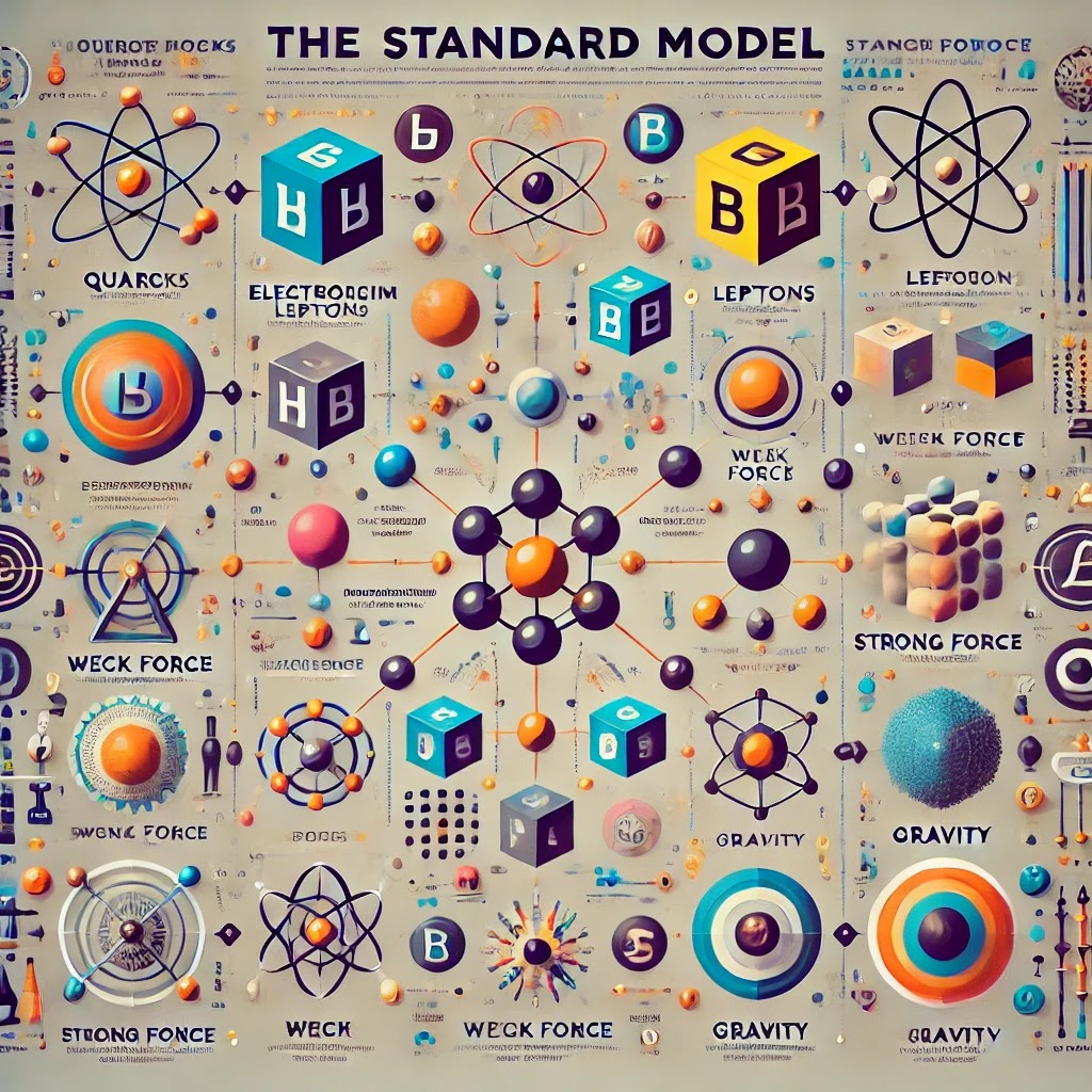 Standart model, temel parçacıkların ve kuvvetlerin nasıl etkileştiğini açıklar. Bu model, kuarklar, leptonlar ve gauge bosonları içerir. Kuarklar, protonlar ve nötronlar gibi hadronları oluştururken, leptonlar elektronlar gibi temel parçacıkları temsil eder. Gauge bosonlar ise kuvvet taşıyıcı parçacıklardır ve elektromanyetik kuvvet, zayıf kuvvet ve güçlü kuvvetleri taşırlar.